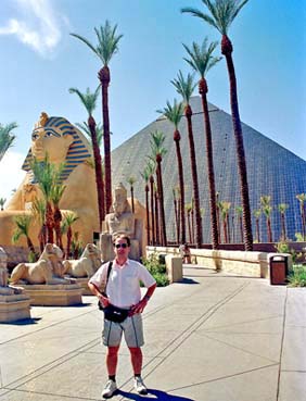 De uma certa forma, os cassinos de Vegas lembram aqueles antigos concursos de fantasia do carnaval, pois parecem estar sempre competindo entre si pelos prêmios nas categorias luxo ou originalidade. Desde pirâmides egípcias até gôndolas de Veneza. Desde torres espaciais até os arranha céus de New York, a imaginação dos projetistas destes cassinos parece não ter limites. Também em seus interiores, cada detalhe de acabamento é pensado para fazer um turista sentir-se dentro de um mundo à parte, um lugar onde a iluminação é sempre igual, a temperatura é sempre a mesma, e onde o tilintar das coloridas maquinas caça níqueis nunca para, seja dia ou noite, oferecendo a chance a quem passa de se tornar milionário com uma simples aposta. Ao lado, o cassino Luxor, no formato de uma pirâmide egípcia, tendo na frente uma reprodução da Esfinge.