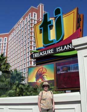 Ao lado, a fachada do Treasure Island, rebatizado simplesmente TI. No lago em frente é apresentado, todas as noites, um dos shows mais concorridos da cidade, o