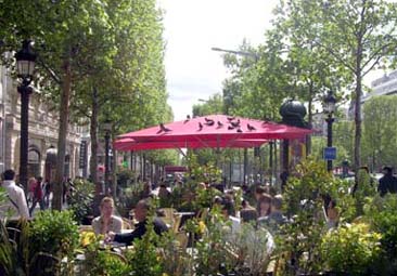 Mesas de restaurantes na calçada do Champs Elysées |