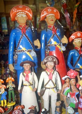 At right, one of the many items found at Feira de Artesanato (souvenirs and handcraft fair), every night at Praia de Iracema beach, from 6 to 10 PM. The small figures are Lampiao and his wife Maria Bonita, the most notorious robbers from the past, that became quite famous at northeast Brazil. |