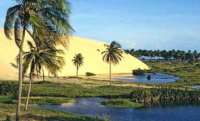 In the state of Ceara you will find almost 400 miles of beaches, sand dunes and tall green palms. Among the best places to visit is the famous Jericoacoara beach (170 miles from Fortaleza). This ancient Indian word means Alligator basking in the sun... And, if there used to be some of them there, they probably chose the best place for basking in the sun, because a recent touristic scenic places survey made by the Washington Post, considered Jericoacoara one of the top ten most beautiful beaches in the world. |